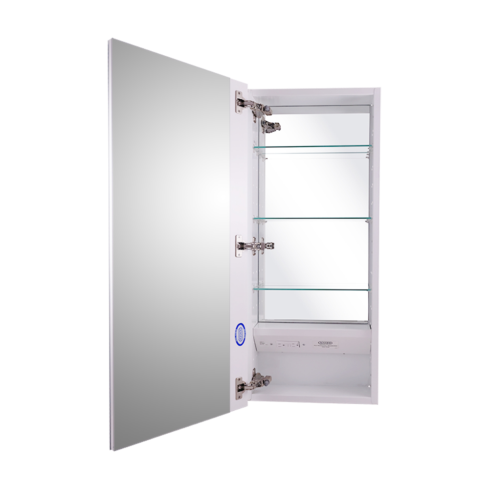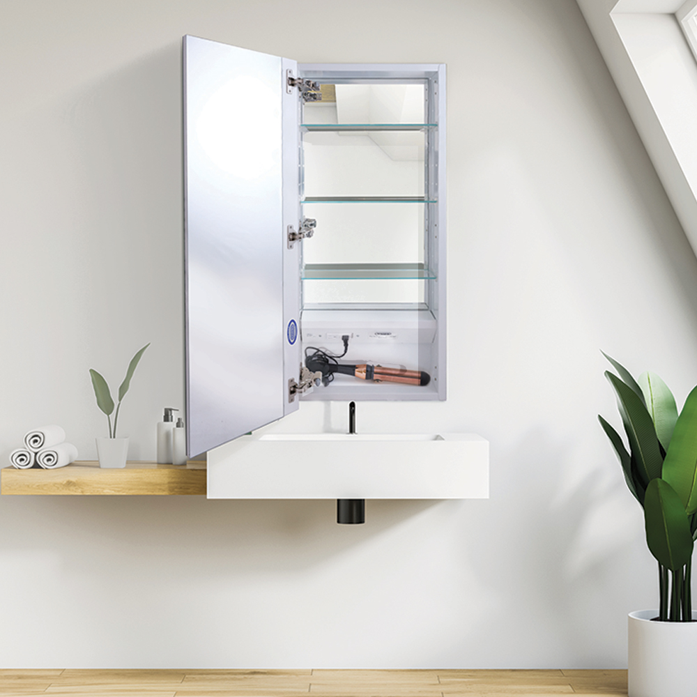 Designed for larger wall spaces, the Jensen 704309 Meridian cabinet features a 15″ x 35″ frameless mirror with beveled edges. It brings soft sophistication to transitional or modern bathrooms and offers ample interior storage behind the seamless mirrored door.